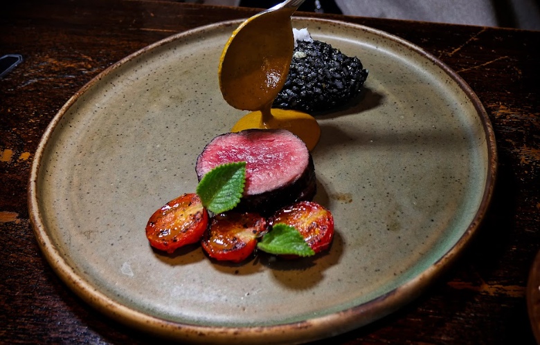 A fizzy grape granita serves as a refreshing palate cleanser, paving the way for the main course—a tantalizing blend of spicy squid ink rice, Cha-mung leaf, Trat’s chili curry sauce, Wagyu beef tenderloin, and sweet grilled tomato.